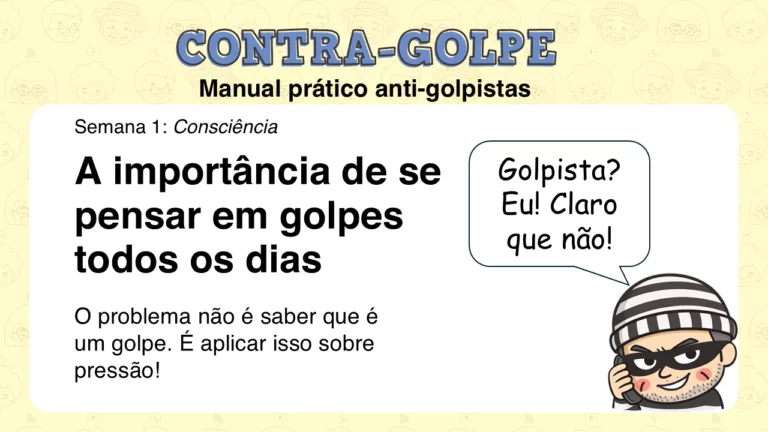 Pode parecer contraditório, mas a melhor maneira de não cair na conversa do golpista é conhecendo muito bem os mecanismos que ele usa para tentar te enganar. O alerta “TEM CHEIRO DE GOLPE” tem que apitar já nas primeiras palavras dele.